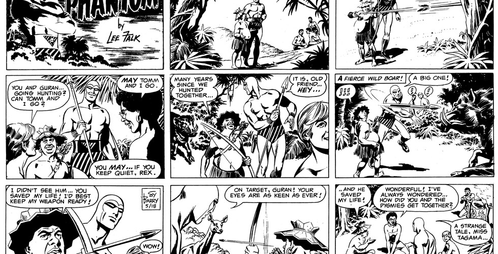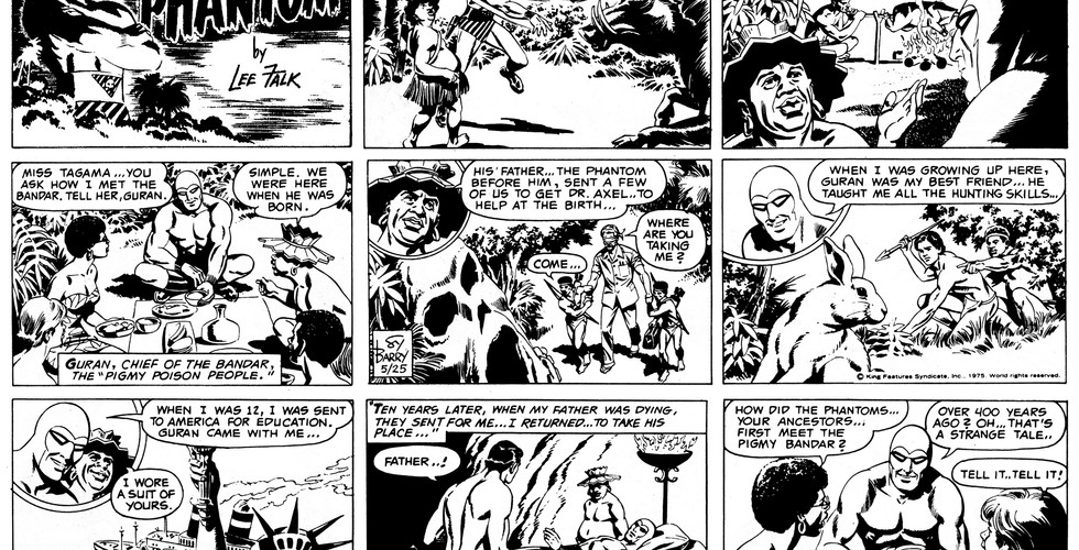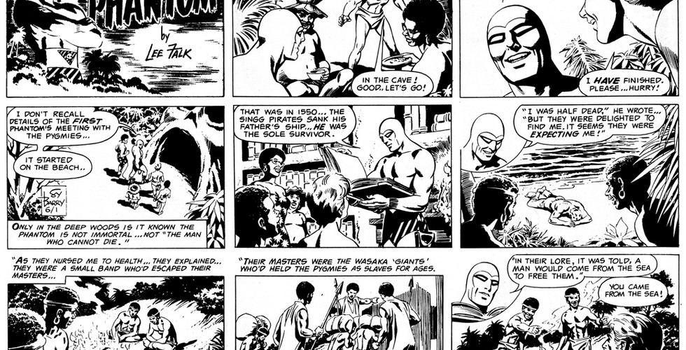 "The First Phantom" is the 96th Phantom Sunday story, first published in newspapers in 1975. The story was written by Lee Falk and drawn by Sy Barry and features Lee Falk fleshing out the origin of the relationship between the Bandar tribe and the Phantom family. This story includes the Bandar tribe originally being enslaved and waiting for a man to be washed upon the shore to rescue them. In reading what Tony DePaul wrote in his blog, this is what it seems he may be looking to rewrite or even remove a possible 'whitewashing' element in a 50-year-old story from established Phantom origin lore.